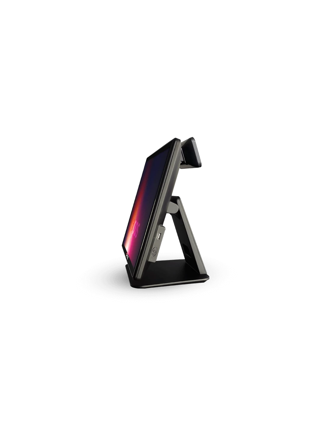 A alimentação é feita através de um adaptador de +12V DC, garantindo uma operação estável e eficiente. O terminal apresenta um design elegante na cor preta, com dimensões de 48cm (altura) x 42,5cm (largura) x 28cm (profundidade). Estas dimensões foram pensadas para proporcionar uma ergonomia ideal e ocupar um espaço mínimo no balcão.