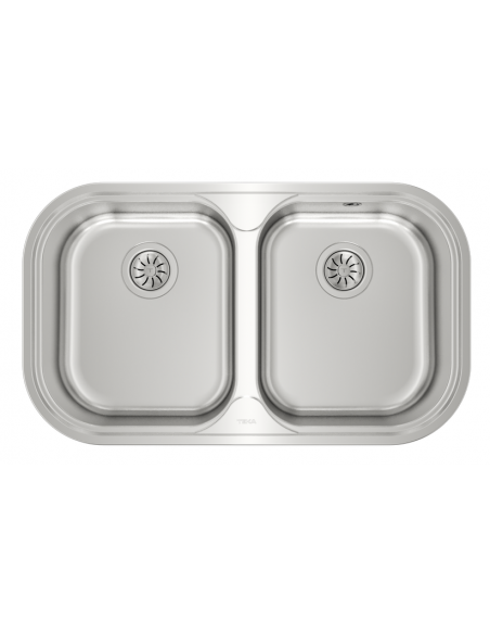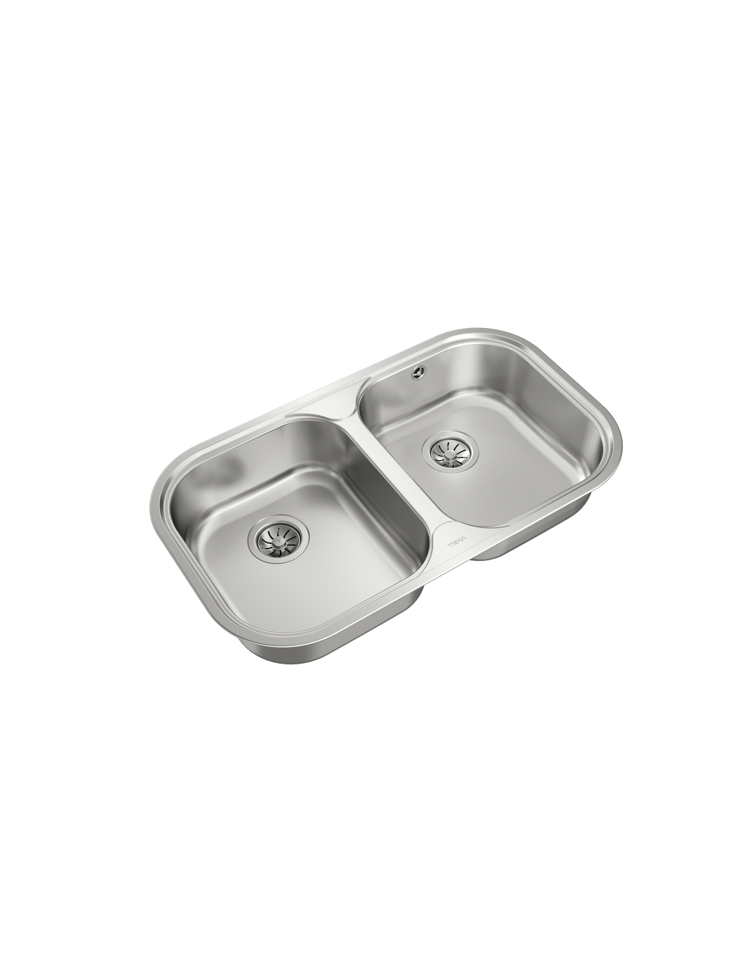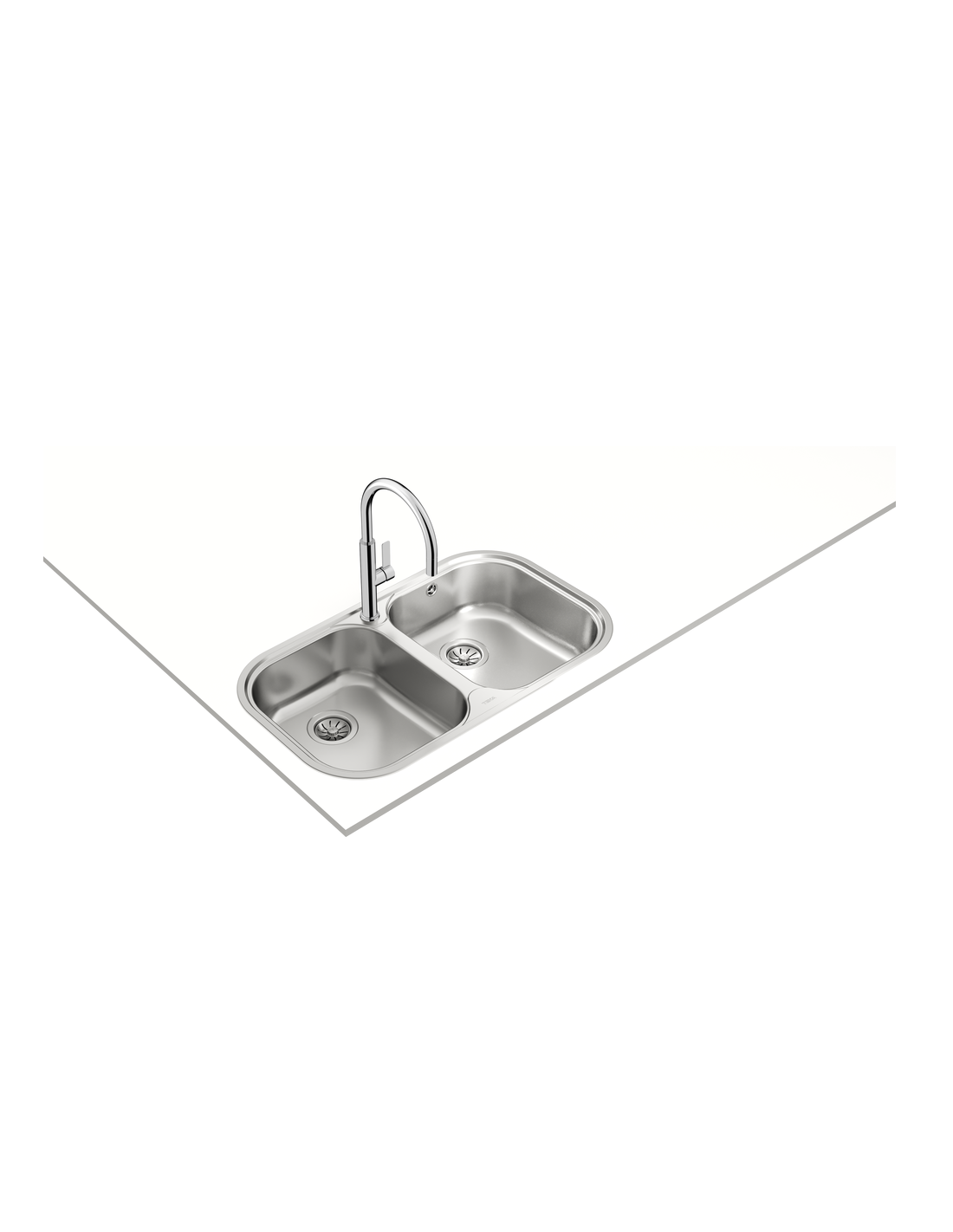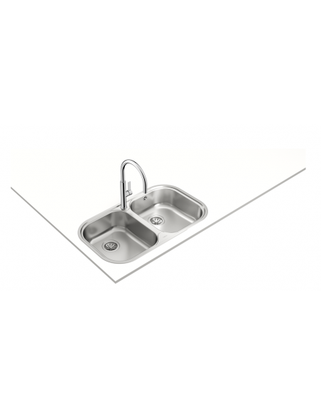 Este modelo destaca-se pela sua simplicidade e funcionalidade. O design é direto, focado na eficiência e no uso prático. A profundidade das bacias é de 170 mm, oferecendo uma capacidade adequada para diferentes necessidades. A instalação é simplificada, sendo um produto de encastre, o que permite uma integração perfeita com a bancada da cozinha.