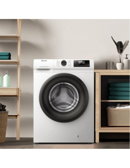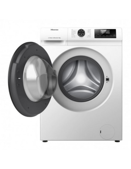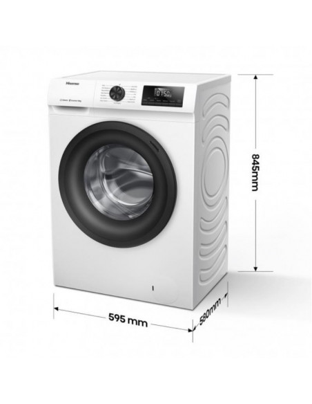 Hisense WF1Q1041BW. Tipo de carga: Carregamento frontal. Capacidade avaliada: 10 kg, Classe de centrifugação: B, Nível de ruído (spin): 74 dB. Classe de lavagem: A. Velocidade máxima de centrifugação: 1400 RPM. Cor do produto: Branco. Largura: 595 mm, Profundidade: 590 mm, Altura: 845 mm. Classe de eficiência energética: A ;