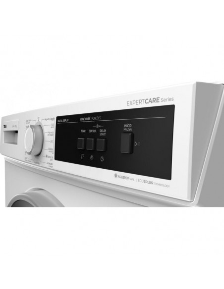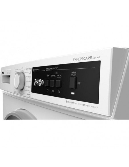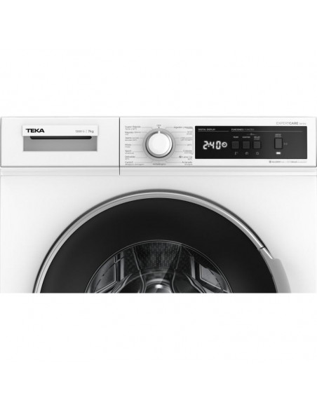 Teka WMT 40720 WH. Tipo de carga: Carregamento frontal. Capacidade avaliada: 7 kg, Classe de centrifugação: B, Nível de ruído (spin): 78 dB, Velocidade máxima de centrifugação: 1200 RPM. Cor do produto: Branco. Largura: 596 mm, Profundidade: 533 mm, Altura: 845 mm. Classe de eficiência energética: D ;