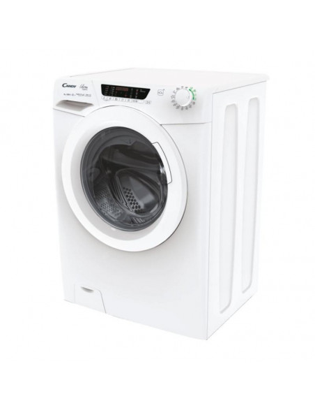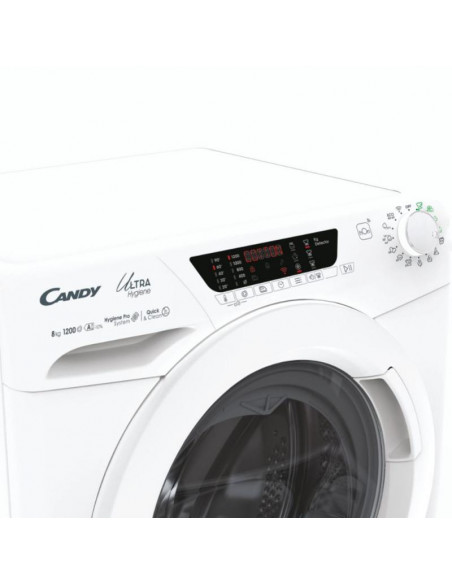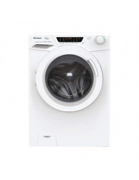 Candy HE 1284TWM6/1-S. Tipo de carga: Carregamento frontal. Capacidade avaliada: 8 kg, Classe de centrifugação: B, Nível de ruído (spin): 74 dB, Velocidade máxima de centrifugação: 1200 RPM. Cor do produto: Branco. Largura: 600 mm, Profundidade: 530 mm, Altura: 850 mm. Classe de eficiência energética: A. ;