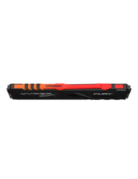Da rienda suelta a tu estilo. Da rienda suelta a tu FURY.\n\nHyperX® FURY DDR4 RGB* ofrece un aumento de rendimiento y estilo con velocidades de hasta 3733 MHz**, un estilo agresivo e iluminación RGB que recorre la longitud del módulo para lograr efectos increíbles y sorprendentes. Esta impresionante y económica actualización está disponible en velocidades de 2400 MHz-3733 MHz, latencias de CL15-19, capacidades de módulo único de 4 GB-32 GB y capacidades de kit de 16 GB-128 GB. Cuenta con overclocking automático de Plug N Play a velocidades de 2400 MHz y 2666 MHz y es compatible con Intel XMP y Ryzen. HyperX FURY DDR4 RGB se mantiene refrigerada gracias a su disipador de calor elegante y de bajo perfil. Totalmente probada a altas velocidades y respaldada por una garantía de por vida, se trata de una actualización sencilla y práctica para tu sistema Intel o AMD.\n\n- Retroiluminación RGB impresionante con estilo agresivo*\n- Tecnología de sincronización infrarroja de HyperX pendiente de patente\n- Compatible con XMP de Intel\n- Compatible con AMD Ryzen\n- Velocidades de hasta 3733 MHz y capacidades de hasta 128 GB\n- Funcionalidad Plug N Play a 2400 MHz y 2666 MHz**\n\n* Iluminación personalizable con el software HyperX NGENUITY o con el software de control RGB de la placa base. La compatibilidad de la personalización de RGB con software de terceros puede variar.\n\n**La memoria HyperX Plug N Play funcionará en los sistemas DDR4 a la velocidad máxima permitida por el BIOS del sistema del fabricante. PnP no puede aumentar la velocidad de la memoria de sistema por encima de lo que permite la BIOS del fabricante. Los productos HyperX Plug N Play DDR4 son compatibles con las especificaciones XMP 2.0, por lo que es posible alcanzar el overclocking habilitando el perfil XMP integrado.