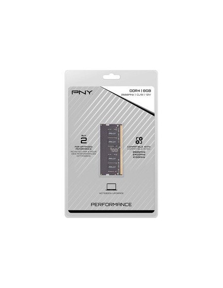 PNY MN8GSD42666. Componente para: Portátil, Memoria interna: 8 GB, Diseño de memoria (módulos x tamaño): 1 x 8 GB, Tipo de memoria interna: DDR4, Velocidad de memoria del reloj: 2666 MHz, Latencia CAS: 19