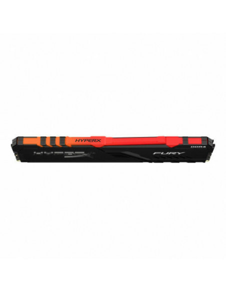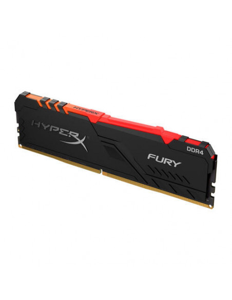 Da rienda suelta a tu estilo. Da rienda suelta a tu FURY.\n\nHyperX® FURY DDR4 RGB* ofrece un aumento de rendimiento y estilo con velocidades de hasta 3733 MHz**, un estilo agresivo e iluminación RGB que recorre la longitud del módulo para lograr efectos increíbles y sorprendentes. Esta impresionante y económica actualización está disponible en velocidades de 2400 MHz-3733 MHz, latencias de CL15-19, capacidades de módulo único de 4 GB-32 GB y capacidades de kit de 16 GB-128 GB. Cuenta con overclocking automático de Plug N Play a velocidades de 2400 MHz y 2666 MHz y es compatible con Intel XMP y Ryzen. HyperX FURY DDR4 RGB se mantiene refrigerada gracias a su disipador de calor elegante y de bajo perfil. Totalmente probada a altas velocidades y respaldada por una garantía de por vida, se trata de una actualización sencilla y práctica para tu sistema Intel o AMD.\n\n- Retroiluminación RGB impresionante con estilo agresivo*\n- Tecnología de sincronización infrarroja de HyperX pendiente de patente\n- Compatible con XMP de Intel\n- Compatible con AMD Ryzen\n- Velocidades de hasta 3733 MHz y capacidades de hasta 128 GB\n- Funcionalidad Plug N Play a 2400 MHz y 2666 MHz**\n\n* Iluminación personalizable con el software HyperX NGENUITY o con el software de control RGB de la placa base. La compatibilidad de la personalización de RGB con software de terceros puede variar.\n\n**La memoria HyperX Plug N Play funcionará en los sistemas DDR4 a la velocidad máxima permitida por el BIOS del sistema del fabricante. PnP no puede aumentar la velocidad de la memoria de sistema por encima de lo que permite la BIOS del fabricante. Los productos HyperX Plug N Play DDR4 son compatibles con las especificaciones XMP 2.0, por lo que es posible alcanzar el overclocking habilitando el perfil XMP integrado.