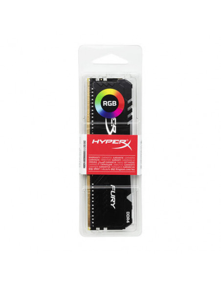 Da rienda suelta a tu estilo. Da rienda suelta a tu FURY.\n\nHyperX® FURY DDR4 RGB* ofrece un aumento de rendimiento y estilo con velocidades de hasta 3733 MHz**, un estilo agresivo e iluminación RGB que recorre la longitud del módulo para lograr efectos increíbles y sorprendentes. Esta impresionante y económica actualización está disponible en velocidades de 2400 MHz-3733 MHz, latencias de CL15-19, capacidades de módulo único de 4 GB-32 GB y capacidades de kit de 16 GB-128 GB. Cuenta con overclocking automático de Plug N Play a velocidades de 2400 MHz y 2666 MHz y es compatible con Intel XMP y Ryzen. HyperX FURY DDR4 RGB se mantiene refrigerada gracias a su disipador de calor elegante y de bajo perfil. Totalmente probada a altas velocidades y respaldada por una garantía de por vida, se trata de una actualización sencilla y práctica para tu sistema Intel o AMD.\n\n- Retroiluminación RGB impresionante con estilo agresivo*\n- Tecnología de sincronización infrarroja de HyperX pendiente de patente\n- Compatible con XMP de Intel\n- Compatible con AMD Ryzen\n- Velocidades de hasta 3733 MHz y capacidades de hasta 128 GB\n- Funcionalidad Plug N Play a 2400 MHz y 2666 MHz**\n\n* Iluminación personalizable con el software HyperX NGENUITY o con el software de control RGB de la placa base. La compatibilidad de la personalización de RGB con software de terceros puede variar.\n\n**La memoria HyperX Plug N Play funcionará en los sistemas DDR4 a la velocidad máxima permitida por el BIOS del sistema del fabricante. PnP no puede aumentar la velocidad de la memoria de sistema por encima de lo que permite la BIOS del fabricante. Los productos HyperX Plug N Play DDR4 son compatibles con las especificaciones XMP 2.0, por lo que es posible alcanzar el overclocking habilitando el perfil XMP integrado.