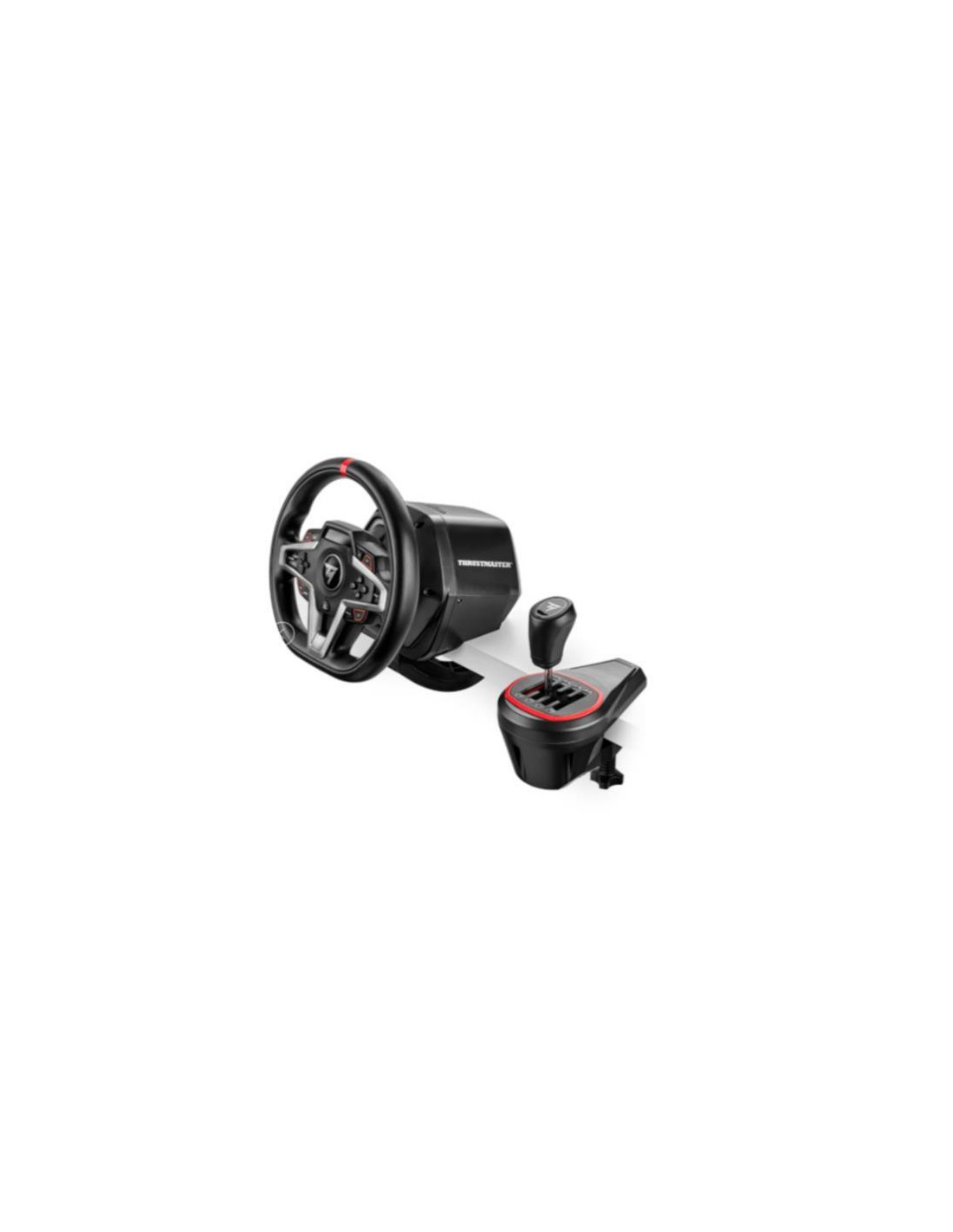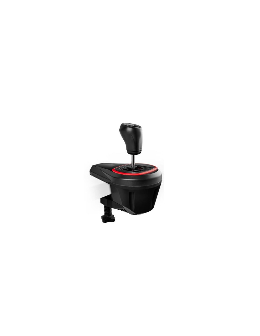 Alavanca de mudanças Thrustmaster TH8S Shifter Add-on, compatível com vários volantes de corrida. Design em preto e vermelho. Dimensões compactas para fácil integração. Inclui cabo USB Tipo A para USB Tipo C.