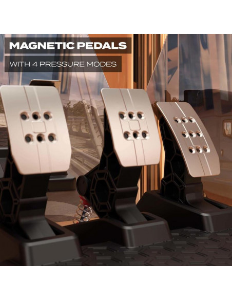 O ecrã LCD integrado no volante fornece informações cruciais sobre o seu desempenho em tempo real, tais como velocidade, RPM e marcha, mantendo-o sempre informado e focado na corrida. Os pedais magnéticos garantem precisão e respostas rápidas, permitindo-lhe efetuar mudanças de marcha com fluidez e precisão. A sua ergonomia cuidadosamente estudada assegura conforto e precisão durante longas sessões de jogo. O design robusto e os materiais de alta qualidade garantem durabilidade e resistência ao desgaste.