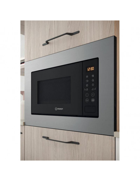 O Micro-ondas Indesit MWI120GX é um modelo encastrável com grill, capacidade de 20L e potência de 800W. Oferece controlo por toque e design em aço inoxidável.