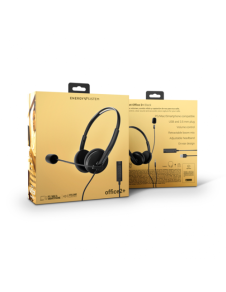 Os auscultadores Energy Sistem Office 2+ pretos são uma opção versátil para uso profissional e pessoal. Com conectores USB e 3.5mm, estes auscultadores oferecem um som de alta qualidade e um microfone integrado para chamadas claras. O seu design retrátil torna-os práticos e fáceis de transportar.