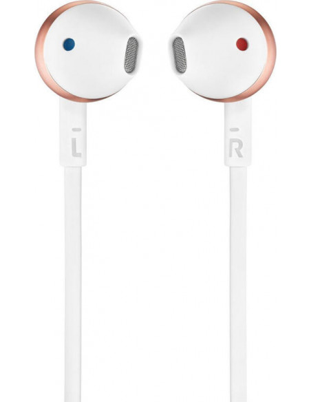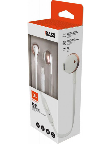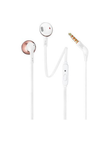 <>Auriculares ,JBL T205 ,en color blanco con detalles en color oro rosa, micró,fono integrado, control remoto de 1 botó,n, cable plano antienredos, diseñ,o ergonó,mico Comfort-Fit, acabado metalizado, alta calidad. Incluye bolsa de transporte.