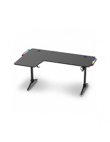 Secretária gaming Spirit of Gamer Headquarter 600, com design em L, ideal para setups com múltiplos monitores, teclado e rato. A sua estrutura metálica proporciona estabilidade, enquanto a bandeja em MDF ultra resistente suporta todo o seu equipamento. O revestimento com efeito carbono confere um visual moderno. Inclui iluminação RGB personalizável com efeitos dinâmicos ou sincronizados com música, acessíveis através de um botão. A altura de 75 cm e pés ajustáveis garantem o conforto e o prumo perfeito. Inclui ainda acessórios práticos para organização de cabos e equipamentos.
