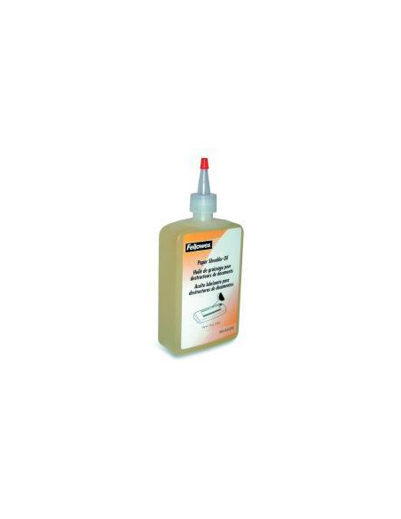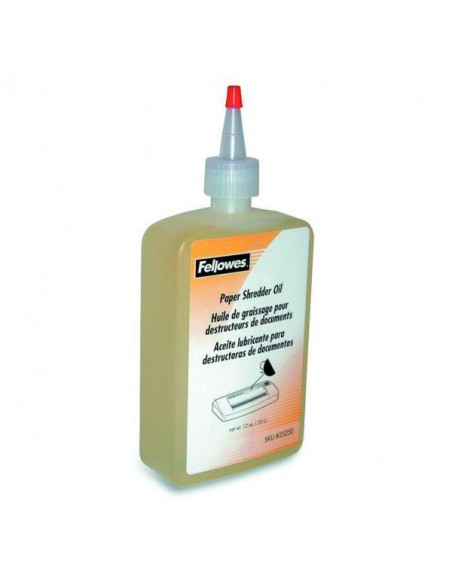 Óleo lubrificante Fellowes para destruidoras de documentos, com 355ml. Formulado com óleo de colza, garante o funcionamento eficiente da sua trituradora, prolongando a sua vida útil.  Reduz o acúmulo de papel nas lâminas e melhora o desempenho de trituradoras de corte de partículas, minicorte e microcorte. Aplicação fácil graças ao bico dispensador.  Recomendada a aplicação sempre que o recipiente for esvaziado ou pelo menos duas vezes por mês. Embalagem feita com materiais 100% reciclados.