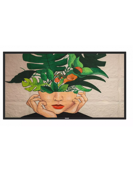 Em termos de design, apresenta uma moldura fina e elegante, em preto, ideal para integração discreta em qualquer espaço. O suporte VESA (400 x 400 mm) permite montagem em parede ou suporte, facilitando a adaptação a diferentes ambientes. Inclui controlo remoto e pilhas, facilitando a sua utilização.