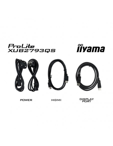 Monitor Iiyama ProLite XU2793QS-B6, um ecrã de 27 polegadas com resolução 2560x1440 (QHD/WQHD) e painel IPS. Oferece uma taxa de atualização de 100Hz e tempo de resposta de 1ms, ideal para jogos e aplicações multimédia. Inclui diversas opções de conectividade e ajustes ergonómicos.