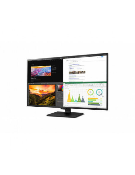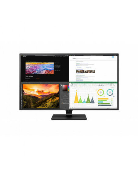 LG 43UN700-B. Tamanho do ecrã na diagonal: 108 cm (42.5"), Resolução: 3840 x 2160 pixels, Tecnologia de apresentação: LED, Superfície do visor: Fosco, Tempo de resposta: 8 ms, Proporção de imagem nativa: 16:9, Ângulo de visão (horizontal): 178°, Ângulo de visão (vertical): 178°. Altifalantes incorporados. Hub USB integrado. Suporte VESA. Cor do produto: Preto