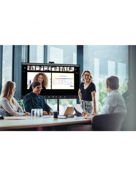 A conectividade é abrangente, com 3 portas HDMI 2.0, 3 portas USB (incluindo USB 2.0, USB 3.2 Gen 1 Tipo-A e Tipo-C), Ethernet LAN (RJ-45), Wi-Fi e uma porta RS-232. Este ecrã integra alta-falantes estéreo com 10W de potência RMS, proporcionando uma experiência sonora completa.