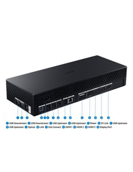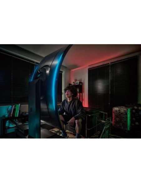 Para conectividade, este monitor dispõe de 3 portas HDMI 2.0/2.1, 1 porta DisplayPort 1.4, e uma porta USB. Inclui ainda funcionalidades adicionais como um comutador KVM incorporado, Wi-Fi 5 (802.11ac) e Bluetooth 5.2. Os utilizadores podem desfrutar de uma experiência sonora imersiva com os alto-falantes integrados de 60 W RMS.