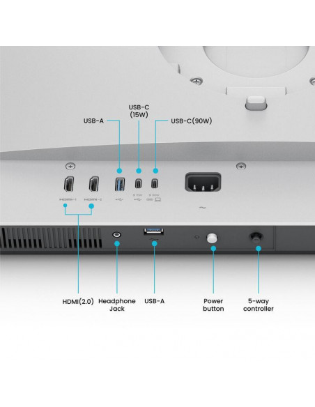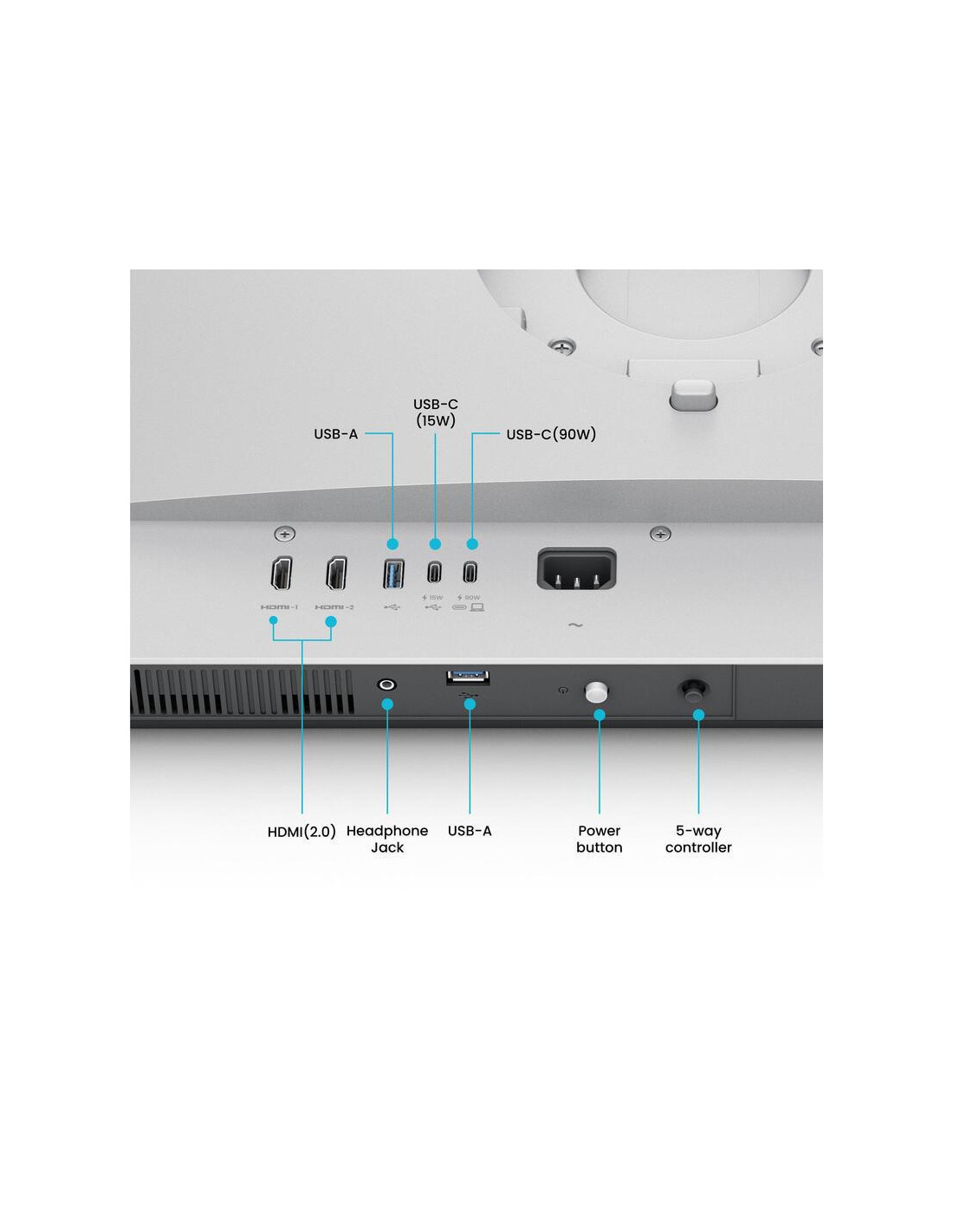 A conectividade é completa e versátil, com duas entradas USB-C e duas entradas HDMI, permitindo conectar facilmente vários dispositivos, incluindo computadores portáteis e outros monitores. A capacidade de Power Delivery USB-C até 90W permite carregar simultaneamente os seus dispositivos ligados ao monitor. O monitor inclui um hub USB com uma porta USB-A para maior conveniência.