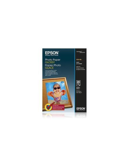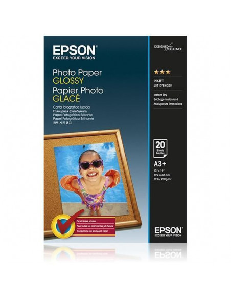 Papel fotográfico Epson Photo Paper Glossy A3+, ideal para impressões fotográficas caseiras de alta qualidade. Este papel brilhante de 200g/m² oferece cores vibrantes e nítidas. Embalagem com 20 folhas. Perfeito para quem procura uma ótima relação qualidade-preço para suas impressões diárias.