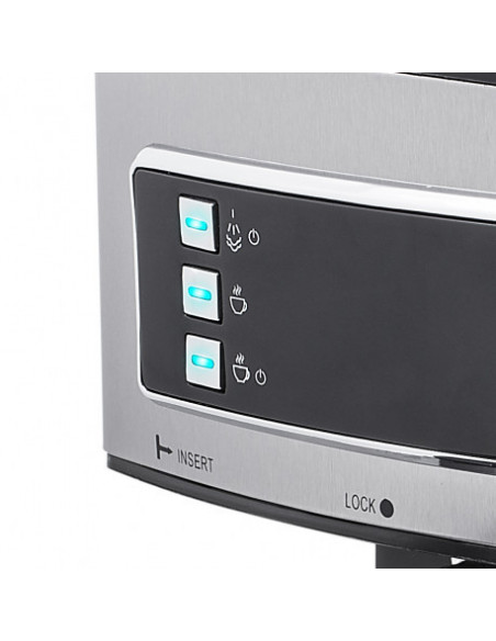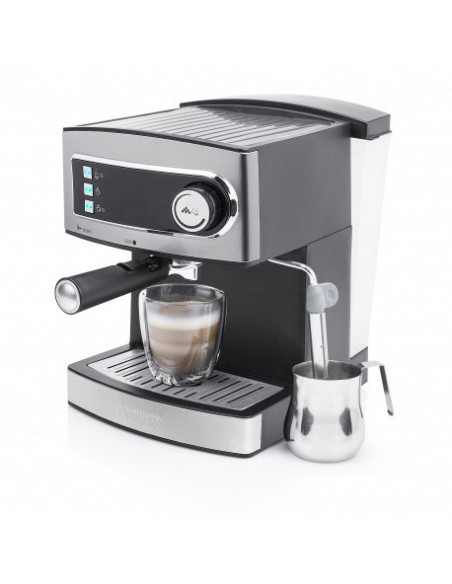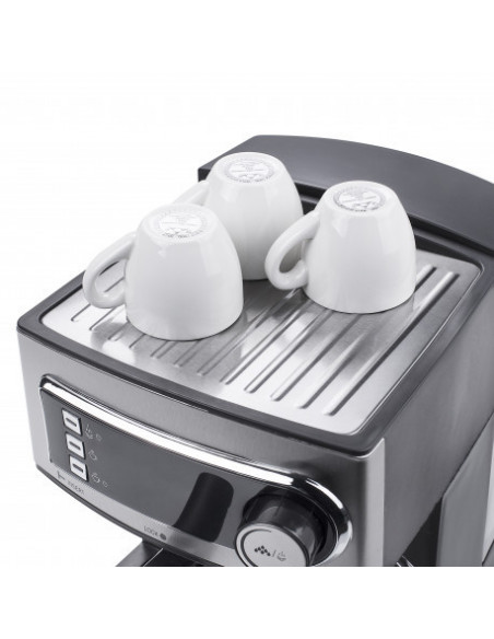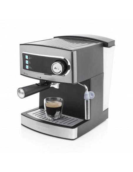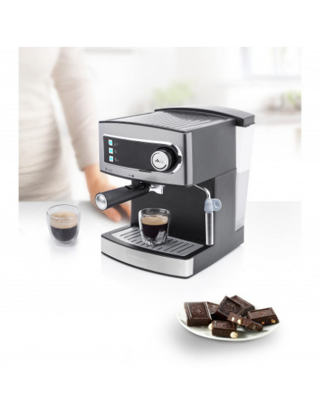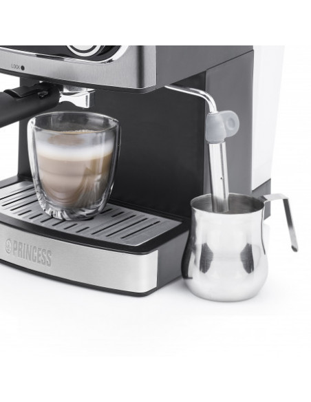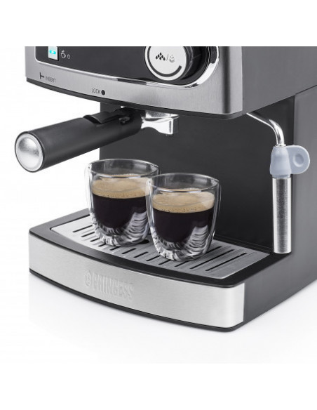 Princess 249407. Design da caixa: Independente, Tipo de produto: Máquina espresso. Volume do depósito de água: 1,6 l, Capacidade em copos: 2 chávenas. Reservatório para café moído: Copo. Tipo de cafeteira: Semiautomático . Número de bicos: 1. Tipo de entrada de café: Café moído. Potência: 850 W. Cor da caixa: Inox