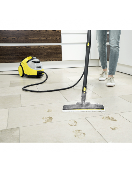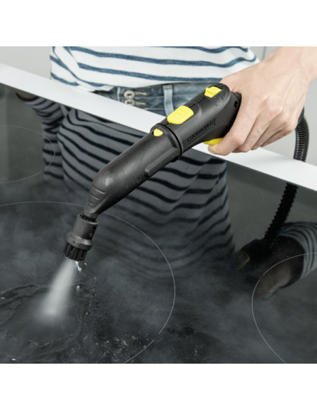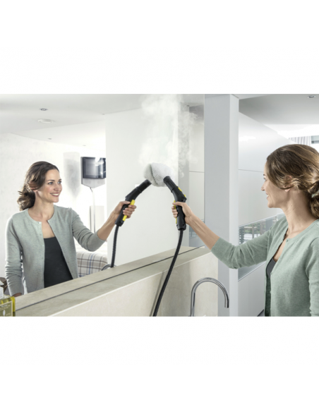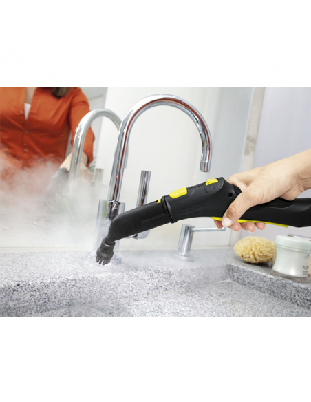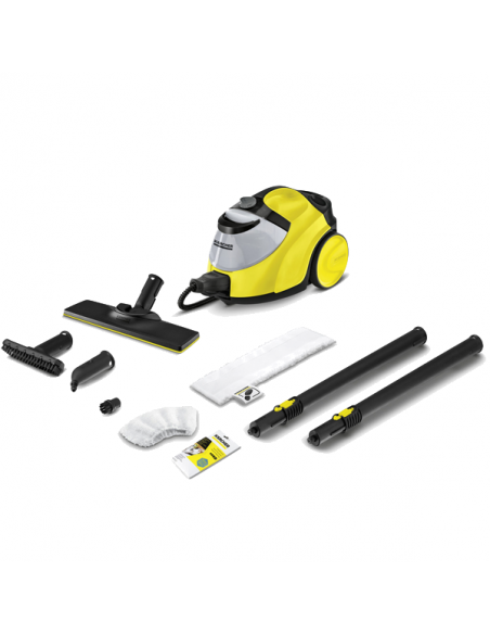 - Equipamento: Regulação do caudal de vapor, no aparelho (vários níveis); Mangueira de vapor com pistola, 2.3 m; Pó de descalcificação; Funil integrado; Interruptor ligar/desligar integrado; Fecho de segurança à prova de crianças; Pano de microfibras para pavimentos; Cobertura de micorfibra para bocal manual; Arrumação de acessórios e posição de estacionamento; Válvula de segurança; Função VapoHydro; Sistema de 2 depósitos
