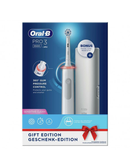 Oral-B Pro 3 3500. Utilizar con: Adulto, Modos del cepillo de dientes: Cuidados diarios, Sensible, Blanqueador, Color del producto: Blanco. Fuente de energía: Batería, Tipo de batería: Batería integrada, Tecnología de batería: Ión de litio. Peso: 332,65 g, Ancho del paquete: 94 mm, Profundidad del paquete: 169 mm. Número de empuñaduras incluidas: 1 pieza(s), Número de cabezales incluido: 1 pieza(s). Cantidad por paquete: 1 pieza(s), Ancho de la caja principal: 29,1 cm, Longitud de la caja: 34,8 cm
