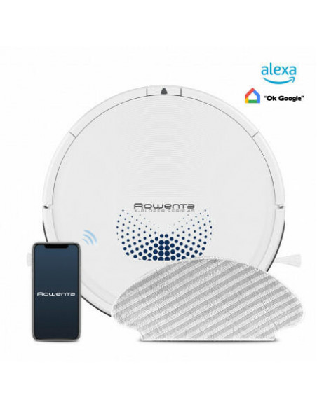 Rowenta X-Plorer Serie 45 RR8277WH. Tipo de coletor de pó: Sem bolsa, Cor do produto: Branco, Forma: Redondo. Capacidade de pó (total): 0,44 l, Nível de ruído: 70 dB, Programas do aspirador de pó: Auto Express, Automático, Wall-following. Tecnologia da bateria: Ião-lítio, Tempo de funcionamento: 150 min, Duração da bateria: 150 m². Altura: 80 mm, Largura: 315 mm, Profundidade: 315 mm. Comprimento da embalagem: 133 mm, Profundidade da embalagem: 491 mm, Altura da embalagem: 418 mm