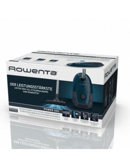 Rowenta Power XXL RO3126EA. Potência máxima de entrada: 900 W. Tipo de limpeza: Seco, Tipo de coletor de pó: Saco de pó, Capacidade de pó: 4,5 l. Filtro de ar de aspirador: Filtro de Higiene, Método de separação do lixo: Filtrante, Nível de ruído: 76 dB. Cor do produto: Azul