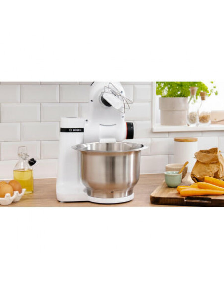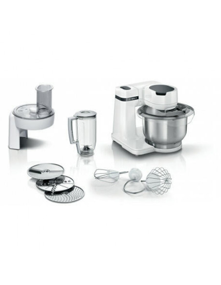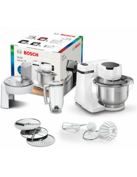 Bosch MUMS2EW20. Capacidade da tigela: 3,8 l, Cor do produto: Branco, Funções de mistura: Triturar, Amassar, Misturar, Mexer. Material da taça: Aço inoxidável, Material do corpo do produto: Plástico. Potência: 700 W, Voltagem de entrada AC: 220-240 V, Frequência de entrada AC: 50/60 Hz. Largura: 266 mm, Profundidade: 266 mm, Altura: 277 mm. Comprimento da embalagem: 350 mm, Profundidade da embalagem: 390 mm, Altura da embalagem: 595 mm