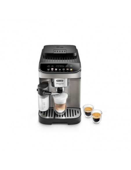 A Magnifica Evo é capaz de preparar uma variedade de bebidas, incluindo espressos, cappuccinos e lattes macchiatos, satisfazendo as preferências de todos os membros da família. A sua interface intuitiva e o controlo tátil facilitam a seleção do seu café preferido. O painel de controlo incorpora um visor para uma configuração precisa e simples. A máquina inclui um sistema de leite integrado, para uma preparação perfeita das bebidas com leite. O design elegante e sofisticado em preto e titânio combina com qualquer cozinha moderna.