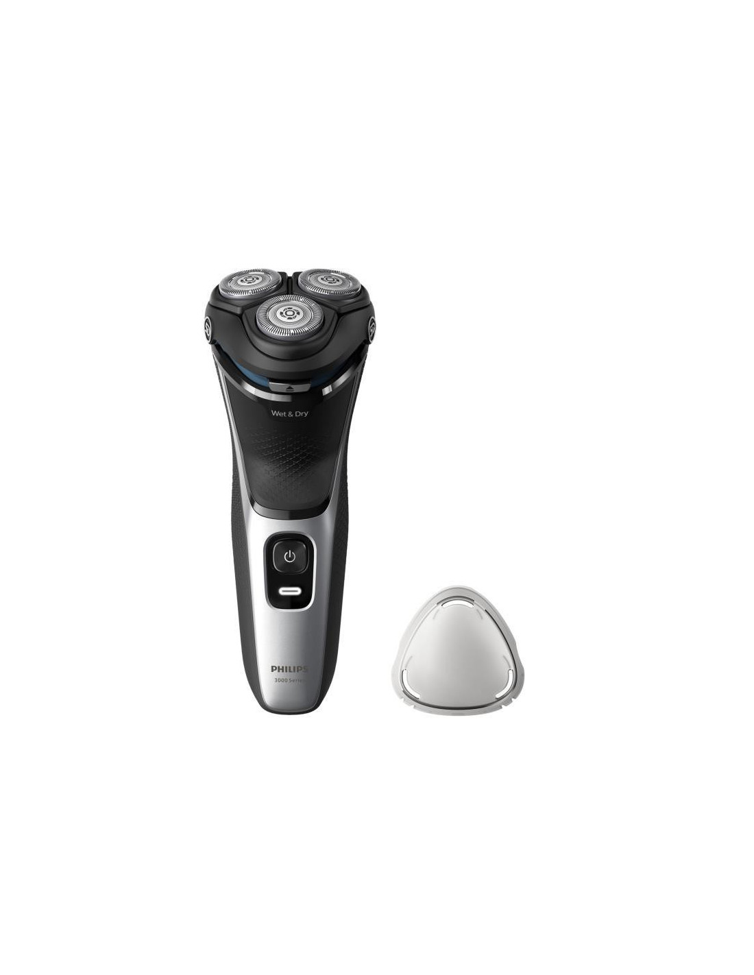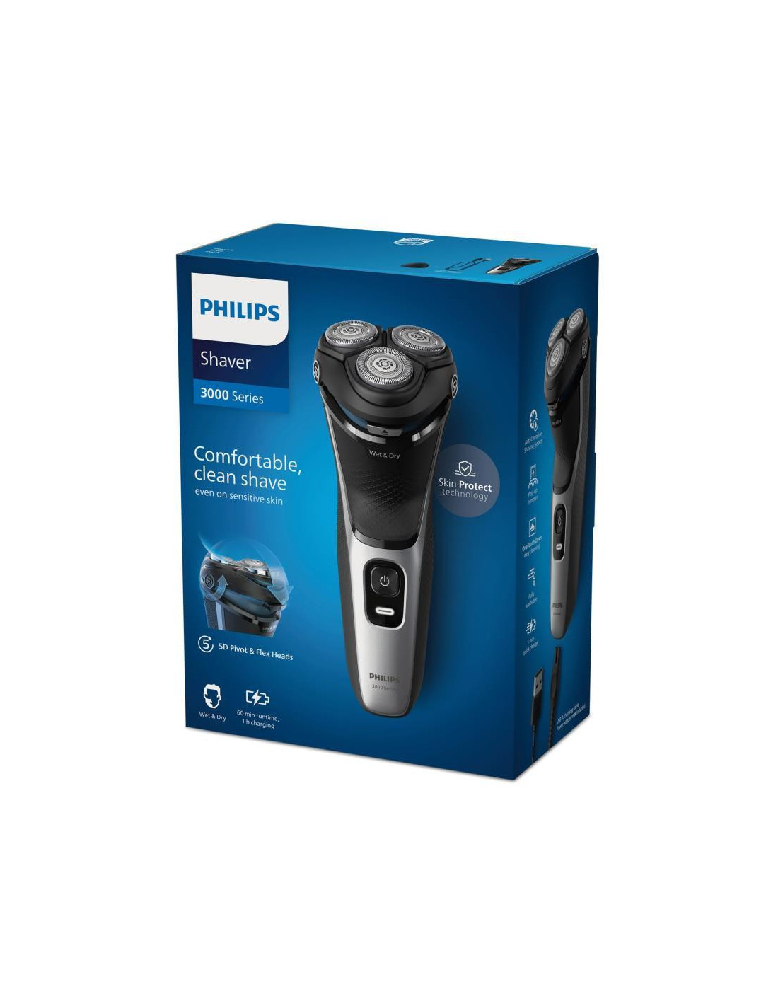 Barbear confortável e perfeito, mesmo em peles sensíveis Com tecnologia SkinProtect A máquina de barbear elétrica a húmido e a seco da série 3000 da Philips proporciona-lhe um barbear confortável e perfeito, mesmo em peles sensíveis. As cabeças Pivot & Flex 5D, as 27 lâminas de afiação automática PowerCut e a utilização a húmido e a seco garantem sempre resultados excelentes e fiáveis. ;