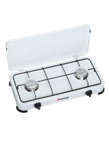 2 Queimadores em aço inoxidável Potência dos queimadores principais: 1,5 kW Tampas fixas dos queimadores Tampa Pés plásticos Pegas integradas Também adequado para utilização no campismo Dimensões: 59 x 32 x 9 cm Peso: 3 kg