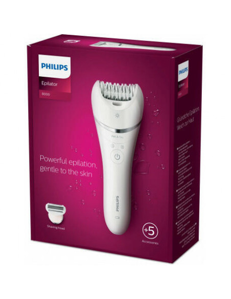 Depilação eficaz. Suave para a pele Pele macia até 4 semanas A depiladora Philips da série 8000 conta com uma depilação eficaz, mas suave, para que possa obter suavidade nas duas meias pernas em apenas 10 minutos. Desfrute das vantagens que vão além da depilação com os acessórios extra.