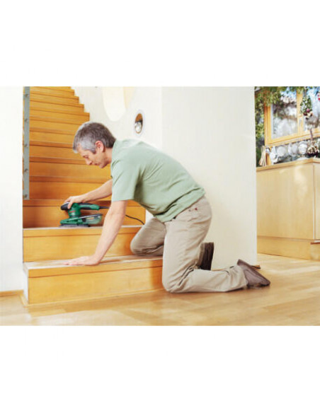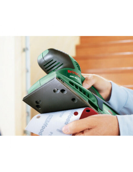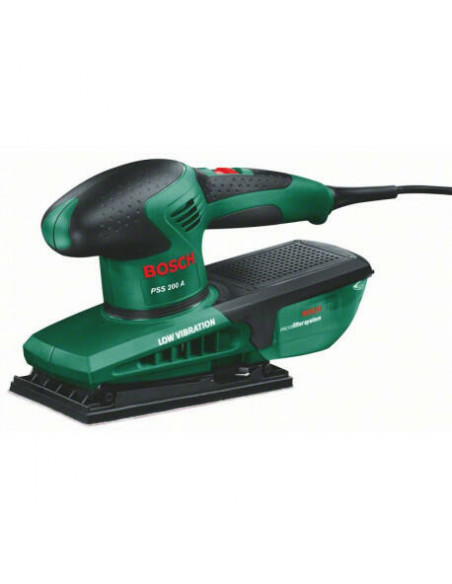Bosch PSS 200 A. Tipo de lixadora: Lixadora orbital, Fixação da cinta de lixamento: Velcro, Cor do produto: Preto, Verde. Taxa de oscilação em vazio (máx.): 24000 OPM, Diâmetro da órbita: 2 mm, Excentricidade: 1 mm. Fonte de alimentação: AC, Potência de input: 200 W, Potência de saída: 125 W. Peso: 1,6 kg, Sanding plate size: 92 x 182 mm, Tamanho da folha de lixa (velcro): 93 x 185 mm. Superfície de lixar: 0,0167 m², Potência: 200 W, Emissão de vibração: 5,5 m/s²