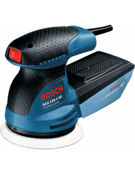 Bosch GEX 125-1 AE Professional. Tipo de lixadora: Lixadora orbital, Fixação da cinta de lixamento: Velcro, Cor do produto: Preto, Azul, Vermelho. Velocidade de marcha lenta (min.): 7500 RPM, Velocidade de marcha lenta (máx.): 12000 RPM, Taxa de oscilação em vazio (mín.): 15000 OPM. Fonte de alimentação: AC. Largura: 227 mm, Altura: 150 mm, Peso: 1,3 kg. Potência: 250 W, Emissão de vibração: 5 m/s², Incerteza K: 1,5 m/s²