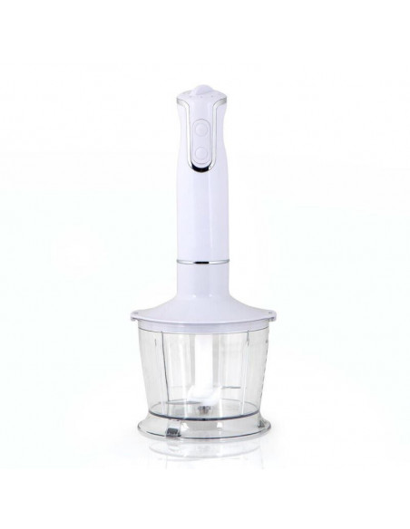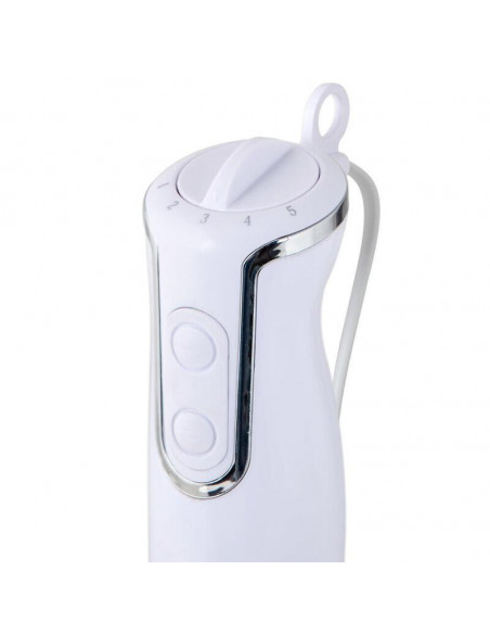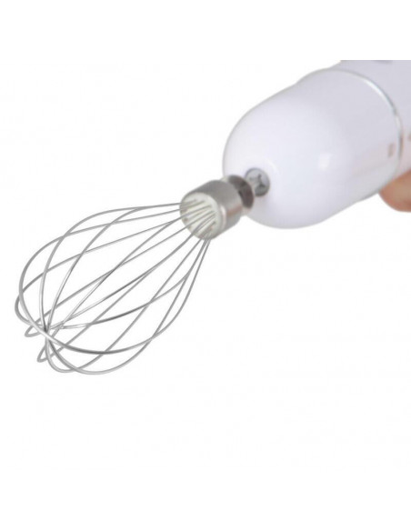 A batedora inclui uma gama de acessórios para atender a diversas necessidades de culinária. A lâmina de aço inoxidável é perfeita para triturar e misturar ingredientes sólidos, garantindo resultados uniformes e consistentes. O vaso misturador de 600 ml com tampa é ideal para preparar sopas, molhos, purés e outros alimentos líquidos ou semi-líquidos. Para tarefas de mistura de alimentos mais leves, o batidor de arame é perfeito para claras de ovos, coberturas e natas. Para tarefas mais específicas, existe ainda um picador universal de 500 ml com tampa, permitindo-lhe picar ervas, cebola e outros ingredientes finamente.