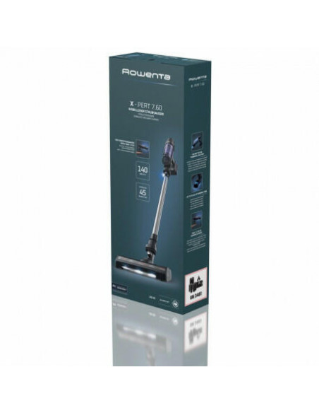 Rowenta X-Pert 7.60 RH6A35WO. Tipo de limpeza: Seco, Método de separação do lixo: Ciclónico, Fluxo de ar: 59,22 l/min. Tipo de coletor de pó: Sem bolsa, Cor do produto: Roxo, Prateado, Capacidade para resíduos secos: 0,44 l. Fonte de alimentação: Bateria, Tempo de funcionamento: 45 min, Tempo de carga: 3 h. Peso: 2 kg, Largura: 240 mm, Profundidade: 248 mm. Escovas de aspirador incluídas: Escova com luzes LED