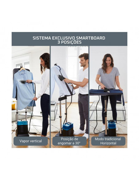A solução de escova de engomar a vapor integral perfeita para uma nova era de cuidados de vestuário Uma solução integral para engomar, vaporizar e higienizar. Com o sistema Smart Board de 3 posições, permite engomar a roupa de forma confortável na vertical, horizontal e a 30°, com ergonomia melhorada. Engome a sua camisa duas vezes mais depressa, graças à inovadora tecnologia de alta pressão e à potência de vapor! Pronta em cerca de 70 segundos, o seu formato ultraleve é também extremamente prático, com uma base amovível para que possa vaporizar e higienizar todos os têxteis da sua casa. ;