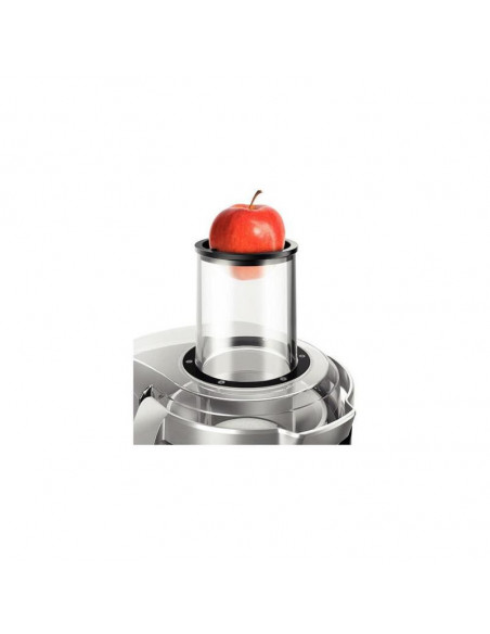 A sua potência de 1000W garante um processamento rápido e eficiente de frutas e vegetais, mesmo os mais duros. O motor de alta resistência garante a durabilidade do produto, permitindo um uso frequente sem comprometer o seu desempenho ao longo do tempo. A boca de enchimento extra larga, com 8,4 cm de diâmetro, permite introduzir frutas inteiras sem a necessidade de pré-corte, economizando tempo e simplificando o processo de preparação.