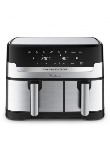 Moulinex Dual Easy Fry EZ905D20. Tipo de produto: Fritadeira a ar quente, Capacidade: 8,3 l. Tipo de construção: Duplo, Cor do produto: Preto, Aço inoxidável, Tipo de controlo: Toque. Tipo de monitor: LCD. Potência: 2450 W ;