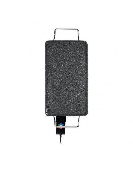 O revestimento antiaderente de mármore garante uma limpeza fácil e rápida após cada utilização. A comida não gruda, facilitando a remoção dos restos alimentares e evitando a necessidade de esfregar excessivamente. Inclui quatro espátulas resistentes e práticas, que permitem virar e mexer os alimentos sem riscar a superfície de cozedura, garantindo assim a durabilidade da plancha. A plancha também possui um botão liga/desliga, uma resistência oculta, ajustes de temperatura reguláveis e um cabo extraível com termostato integrado para maior segurança e controlo durante o processo de cozedura.