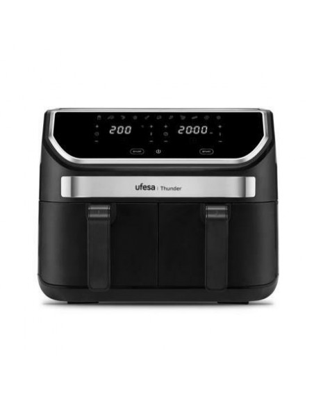 Com a fritadeira de ar Thunder, poderá cozinhar até duas receitas em simultâneo, graças à capacidade de 9 L dividida por duas cubas. Prepare as suas receitas de uma forma mais saudável, com o mínimo de óleo e com grande rapidez, graças à tecnologia 360º de circulação de ar a alta velocidade. Possui onze programas pré-definidos que lhe permitem cozinhar batatas fritas, costeletas, marisco, carne, frango, peixe, piza ou bacon, bem como assar, pré-aquecer e descongelar. Além disso, dispõe de um controlo digital do tempo com um temporizador de até 60 minutos e controlo de temperatura de até 200 ºC. Livre de BPA e PFOA.