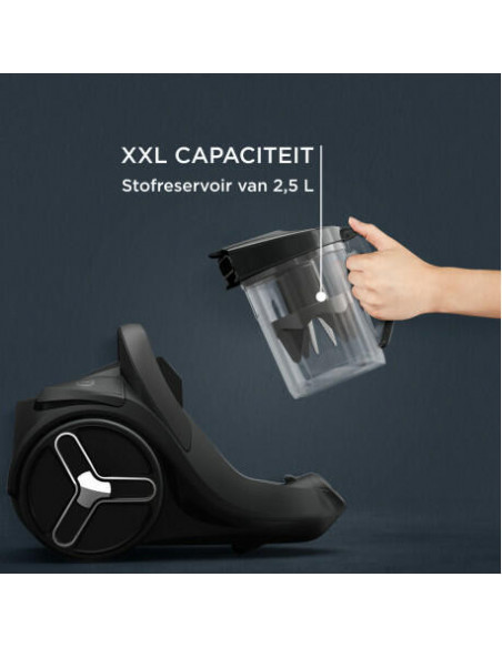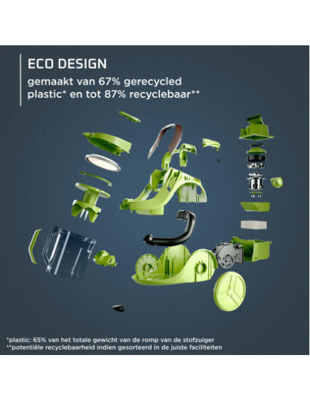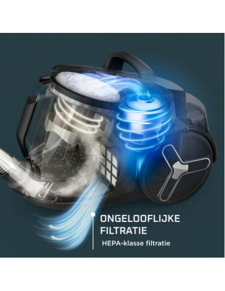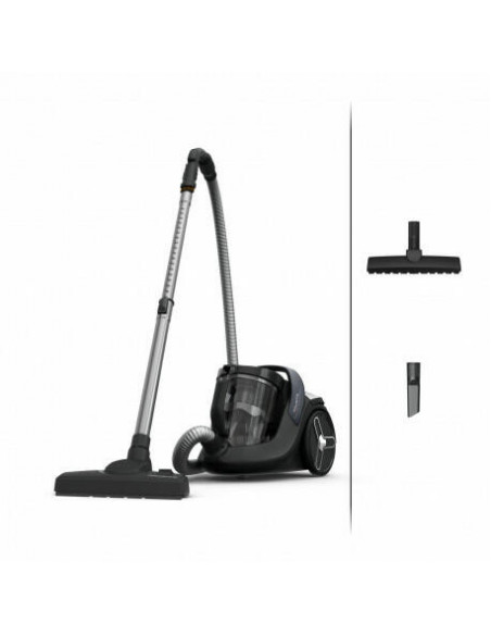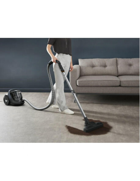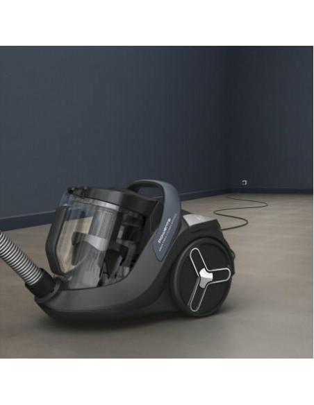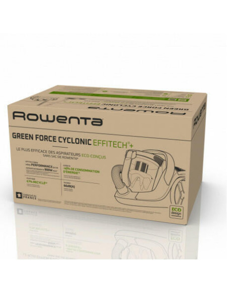 Rowenta Green Force RO7C36EA. Potência máxima de entrada: 500 W. Tipo: Aspirador cilíndrico, Tipo de limpeza: Seco, Tipo de coletor de pó: Sem bolsa, Capacidade de pó: 2,5 l. Filtro de ar de aspirador: HEPA, Método de separação do lixo: Ciclónico, Nível de ruído: 68 dB. Cor do produto: Preto, Cinzento, Azul