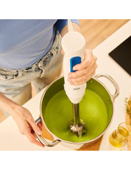 Braun MQ 30001 M. Tipo: Batedeira manual, Cor do produto: Azul, Branco, Funções de mistura: Misturar. Material do corpo do produto: Plástico, Material da lâmina: Aço inoxidável, Material do jarro: Plástico. Potência: 900 W, Tipo de fonte de alimentação: AC. Largura: 62 mm, Profundidade: 208 mm, Altura: 68 mm. Comprimento da embalagem: 160 mm, Profundidade da embalagem: 104 mm, Altura da embalagem: 245 mm ;