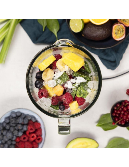 A batidora oferece 4 ajustes de velocidade diferentes, permitindo um controlo preciso da textura da sua mistura. O modo "Pulse" proporciona picos rápidos de potência para quebrar pedaços maiores ou misturar ingredientes mais difíceis. Esta função é especialmente útil para picar gelo, tornando a batidora perfeita para preparar cocktails gelados ou smoothies refrescantes. A jarra de vidro removível de 1,5 litros é ideal para preparar grandes quantidades, suficiente para servir a família ou amigos.