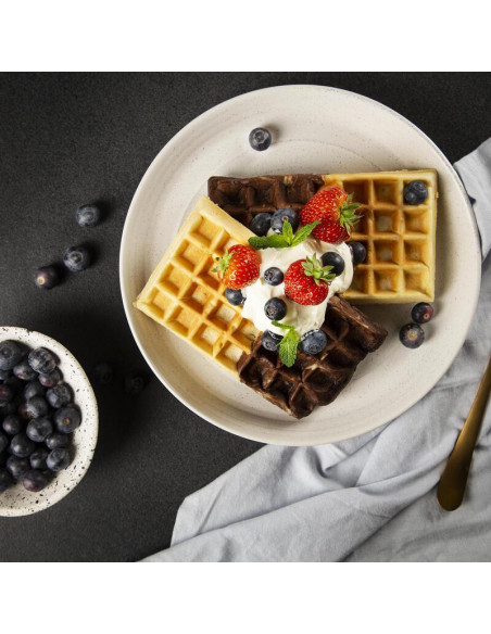 A Gofreira Princess 132397 prepara dois gofres belgas simultaneamente. Com placas antiaderentes, 1200W de potência e termostato ajustável, garante resultados perfeitos e fácil limpeza.