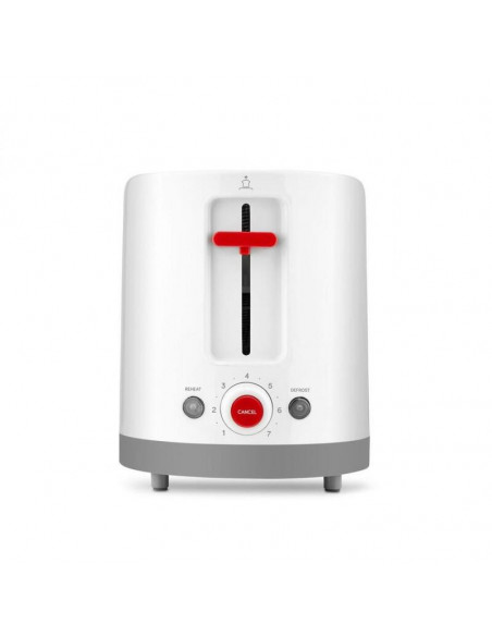 **Funcionalidades e Desempenho:** A tostadora possui duas ranhuras espaçosas, capazes de acomodar duas fatias de pão de cada vez. Com uma potência de 800W, garante um tostado rápido e uniforme, sem queimar o pão. Para um controlo preciso do nível de tostagem, dispõe de sete intensidades ajustáveis, permitindo adaptar o processo às suas preferências pessoais e ao tipo de pão utilizado. As funções adicionais, como descongelar e recalentar, ampliam a versatilidade da tostadora, permitindo aquecer ou descongelar pão pré-congelado rapidamente e de forma conveniente. A bandeja para migalhas removível facilita a limpeza, mantendo a sua tostadora sempre limpa e higienizada.