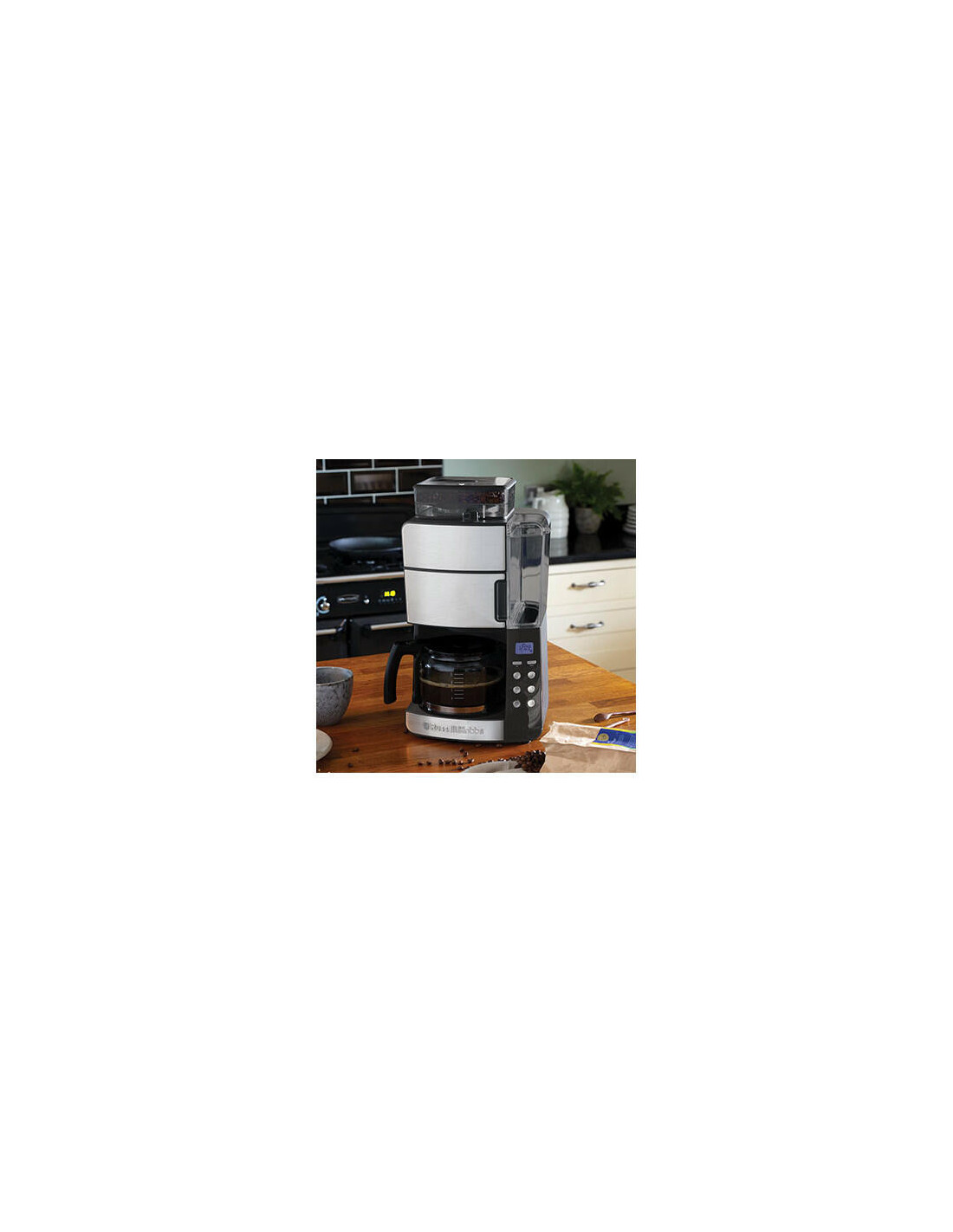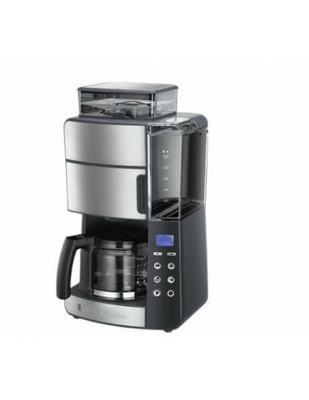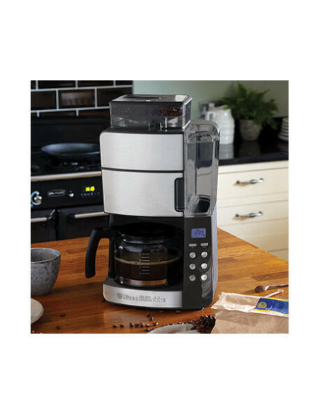 Russell Hobbs Grind and Brew Glass Carafe. Tipo de produto: Máquina de café combinada, Tipo de cafeteira: Completamente automático, Volume do depósito de água: 1,25 l, Tipo de entrada de café: Grãos de café, Reservatório para café moído: Jarro, Capacidade em copos: 10 chávenas, Moinho incorporado. Cor do produto: Preto, Inox