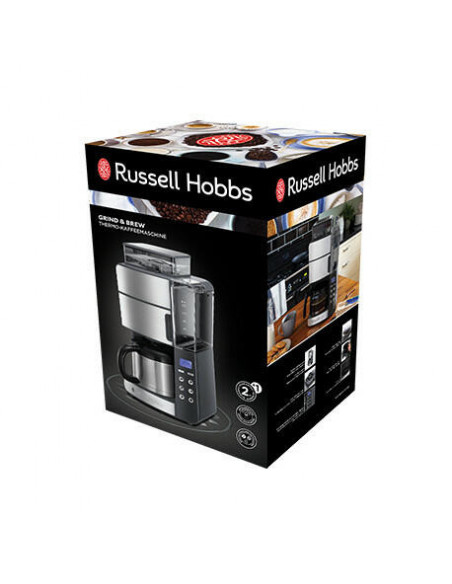 Russell Hobbs Grind and Brew Thermal Carafe. Tipo de produto: Máquina de café combinada, Tipo de cafeteira: Completamente automático, Volume do depósito de água: 1 l, Tipo de entrada de café: Grãos de café, Reservatório para café moído: Jarro, Capacidade em copos: 10 chávenas, Moinho incorporado. Cor do produto: Preto, Inox