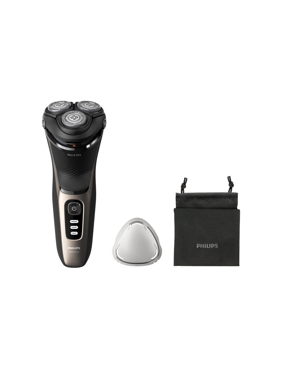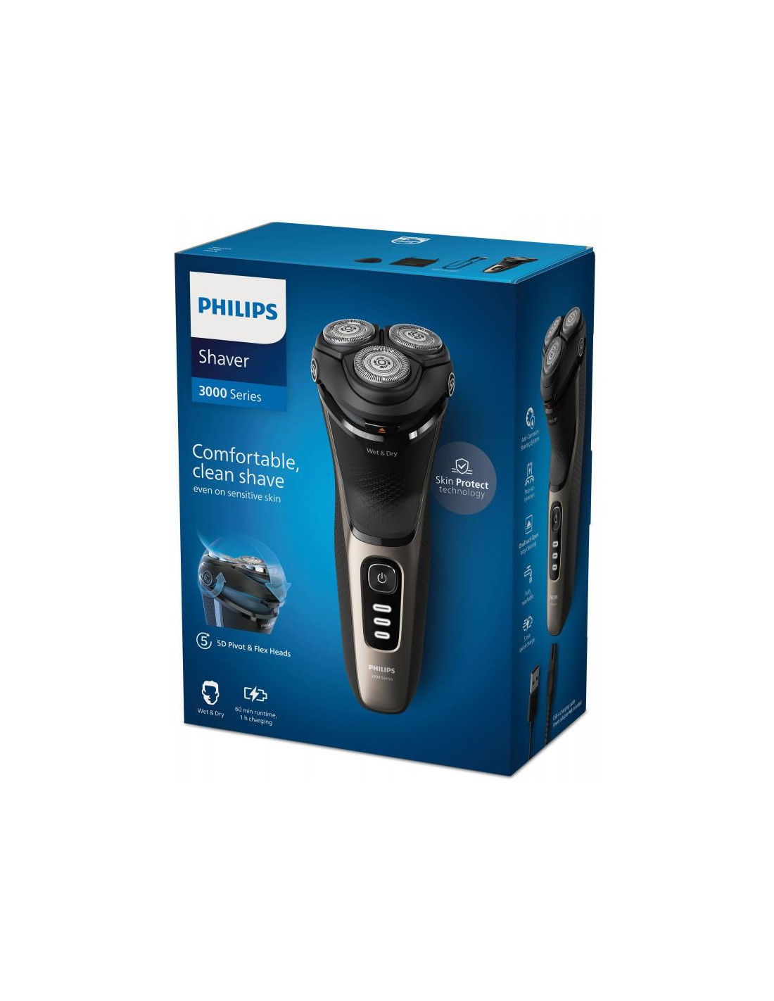 Barbear confortável e perfeito, mesmo em peles sensíveis Com tecnologia SkinProtect A máquina de barbear elétrica a húmido e a seco da série 3000 da Philips proporciona-lhe um barbear confortável e perfeito, mesmo em peles sensíveis. As cabeças Pivot & Flex 5D, as 27 lâminas de afiação automática PowerCut e a utilização a húmido e a seco garantem sempre resultados excelentes e fiáveis. ;